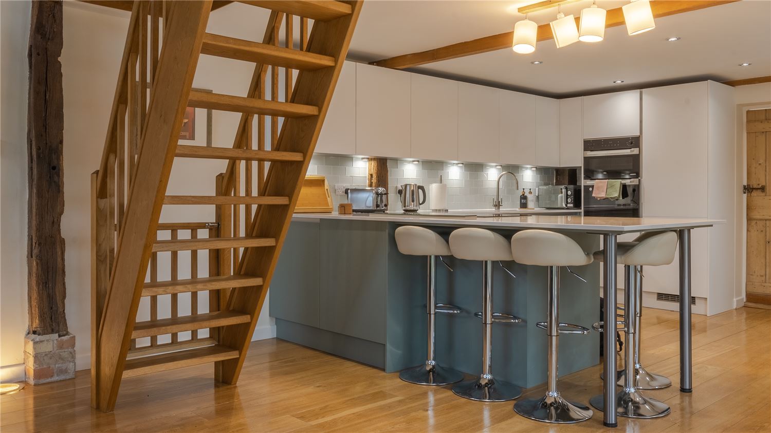 The fully equipped kitchen and its dining area are where you'll prepare and enjoy delicious meals before relaxing in the living room, setting the stage for memorable evenings. Plenty of natural light comes through the large windows, making the home very bright during the day and connecting it to the garden outside. Tastefully picked furniture accent the brick and timber floors under oak beamed ceilings.